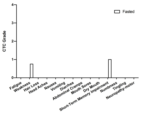 This is a 53-year-old Caucasian female who was diagnosed with stage IIA breast cancer (HER2+) in 2008. After a lumpectomy procedure, she received 4 cycles of adjuvant chemotherapy with TAX (75mg/m2) and CTX (600mg/m2) every 21 days. For all 4 cycles the patient fasted 64 hours prior to and 24 hours post chemotherapy administration (Table 2). Self-reported side effects included mild weakness and short-term memory impairment (Figure 9).