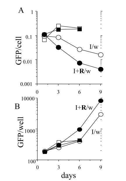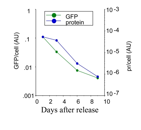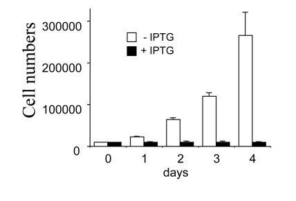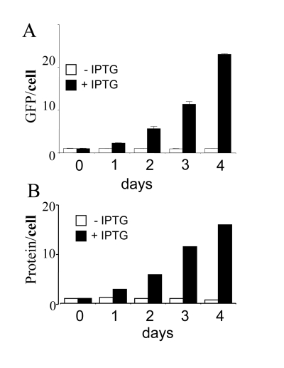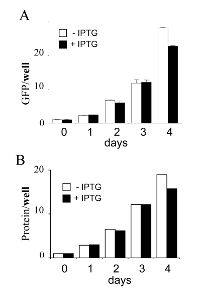 A number of proliferating cells increased exponentially (with a doubling time 20-24 h). As previously described, induction of p21 by IPTG caused G1 and G2 arrest [1,4,5], completely blocking cell proliferation (Figure 1). p21-arrested cells continued to grow in size, becoming hypertrophic. Since the cells contained CMV-driven EGFP, we measured both protein and GFP. Per well, amounts of GFP and protein were increased almost exponentially with or without IPTG (Figure 2). Per cell, amounts of GFP and protein were increased only for IPTG-treated (non-dividing) cells (Figure 3). For proliferating cells (no IPTG), GFP per cell and protein per cell remained constant (Figure 3), because mass growth was balanced by cell division. In contrast, in IPTG-treated cells, protein/cell and GFP/cell increased almost exponentially for 3 days (Figure 3). During induction of senescence by IPTG, cellular mass continued to increase but was not balanced by cell division. In all cases, protein and GFP correlated (Figure 3), making GFP per cell a convenient marker of cellular hypertrophy.