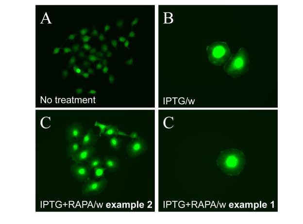 Another common marker of cell senescence is a large cell morphology (hypertrophy). Cellular hypertrophy is usually measured as a cell diameter. Given that volume (or cell mass) is proportional to the cube of diameter, then the amount of protein per cell (cell mass) may be a more sensitive parameter than cell diameter. For example if diameter is increased 2-fold, cell mass is increased 8-fold. In theory, cell mass could be estimated as an amount of any fluorescent protein such as green fluorescent protein (GFP), expressed by a constitutive viral promoter such as CMV promoter. If the cell cycle is blocked but cells continue to grow in size, then GFP should accumulate. Here we tested this prediction. Independently from our study, a clone of HT-p21 cells, known as p21-9, had been stably transfected with CMV-EGFP [13,14,15] and thus expresses enhanced GFP. We predict that induction of p21 by IPTG should increase GFP per cell, as a marker of cellular hypertrophy. Given cell-doubling time of 20 hours, there should be a 10-14 fold increase in GFP/cell in 3 days. Here, we confirmed this prediction. We further investigated the link between mTOR activity, cellular hypertrophy and loss of proliferative potential. We found that preservation of proliferative (competence) was the most sensitive marker of mTOR inhibition, easily detectable even at concentrations of rapamycin when inhibition of mTOR was marginal.