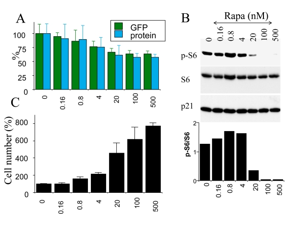 We have demonstrated previously that rapamycin preserved cellular competence (the ability to proliferate after p21 is switched off) in IPTG-arrested HT-p21 cells [10]. We performed these experiments using rapamycin at concentration 500 nM [10], which completely inhibited S6 phosphorylation. Here we determined whether preservation of competence (PC) correlated with inhibition of S6 phosphorylation and the anti-hypertrophic effect of rapamycin. Cells were treated with IPTG and increasing concentrations of rapamycin ranging from 0 to 500 nM (Figure 5 C). After 3 days, IPTG was washed out, thus allowing the cells to proliferate, and after another 5 days cells were counted. As expected, the IPTG-treated cells became incompetent, whereas rapamycin suppressed incompetence (Figure 5 C). Remarkably, preservation of competence was detectable at lower concentrations of rapamycin than those that inhibited either S6 phosphorylation or cellular hypertrophy. In part, such a higher sensitivity of a PC-test compared with inhibition of hypertrophy may be due to the relative magnitudes of the effects (30% inhibition of hypertrophy versus 800% PC). Perhaps even a transient inhibition of mTOR (missed by immunoblot) detectably increased competence. Consistent with this explanation, even when rapamycin was added with delay, preservation of competence was detectable [10].