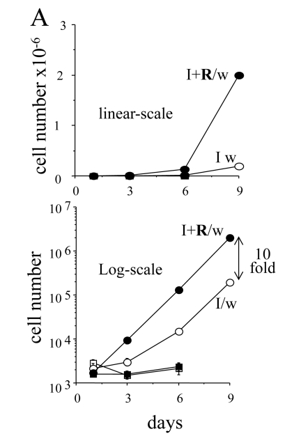 In the presence of IPTG (with or without rapamycin), the cells did not proliferate and did not form colonies. When IPTG was washed out, 3-5% cells remained competent even without rapamycin [10] and Figure 6. Colonies grew in size, while the number of colonies was almost unchanged (Figure 6). Rapamycin increased a number of colonies (a number of competent cells) almost 10- fold. We further compared the proliferative quality of competent cells remained after treatment with IPTG either without or with rapamycin (I/w and I+R/w, respectively). In I/w and I+R/w conditions, the number of cells started to increase exponentially after 1 day and 3 days, respectively (Figure 7). After 6 days, both curves (I/w and I+R/w) became parallel. The curve "I+R/w" was just shifted to the right on approximately 3 days (Figure 7). This corresponded to a 10-fold difference in an initial number of competent cells, if their doubling time was around one day. Noteworthy, this also corresponds to the initial difference in the number of competent cells as determined by colony formation (Figure 6). Also, both in I/w and I+R/w conditions, doubling time of the competent cells was around 20-24 hours, similar to the proliferative rate of the untreated cells.
