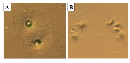Rapamycin decreased cellular hypertrophy approximately 30% in IPTG treated cells (Figure 5A). When IPTG and rapamycin were washed out, there was a lag period about 24-30 hrs for competent cells to undergo first division (supplementary movie will be available at). During the lag period, cells grew in size, because rapamycin was washed out. Consequently, as measured by GFP per cell (Figure 8A), rapamycin-treated cells reached the size of the cells treated with IPTG alone (Figure 8A: I/w and I+R/w at day one). Similarly, as measured by protein per cell, the cells treated with IPTG plus rapamycin become fully hypertrophic at day one after wash (data not shown). Despite regaining hypertrophy, IPTG+rapamycin-treated cells remained competent (Figures 6, 7). This indicates that hypertrophy was not a cause of proliferative incompetence in IPTG-treated cells. When competent cells divided, GFP per cell decreased (Figure 8 B). In agreement, there was a marked difference in cell morphology of typical cells in both conditions (Figure 9). Under I/w conditions, most of the cells were still large and flat, expressing beta-Gal staining. Under I+R/w conditions, predominant cells were with a small-cell morphology and beta-Gal-negative. These cells formed colonies, indicating that they acquired non-senescent morphology due to proliferation (Figure 10 C, example 1). In contrast, senescent cells that did not resume proliferation remained large (Figure 10 C, example 2). Competent cells, while proliferating and forming colonies, became smaller in size (Figure 10 C, example 1). Eventually, the average cell size dropped to normal levels under I+R/w conditions, coincident with a decrease in both the amount of protein/cell and GFP/cell coincided (Supplemental Figure 2), indicating that both are markers of cellular hypertrophy. Despite reversal of hypertrophy and a drop in GFP/cell, the amount of total GFP and protein per well increased due to cell proliferation (Figure 8 B and data not shown).