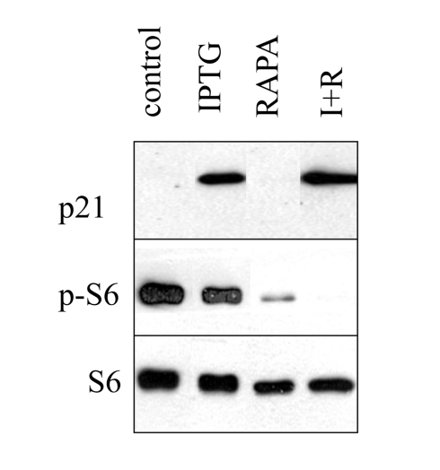 Immunoblot analysis . Cells were lysed and soluble proteins were harvested as previously described [9]. Immunoblot analysis was performed using mouse monoclonal anti-p21, mouse monoclonal anti-phospho-S6 Ser240/244 (Cell Signaling, MA, USA), rabbit polyclonal anti-S6 (Cell Signaling, MA, USA) and mouse monoclonal anti-tubulin Ab as previously described [9].