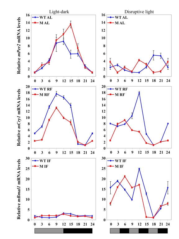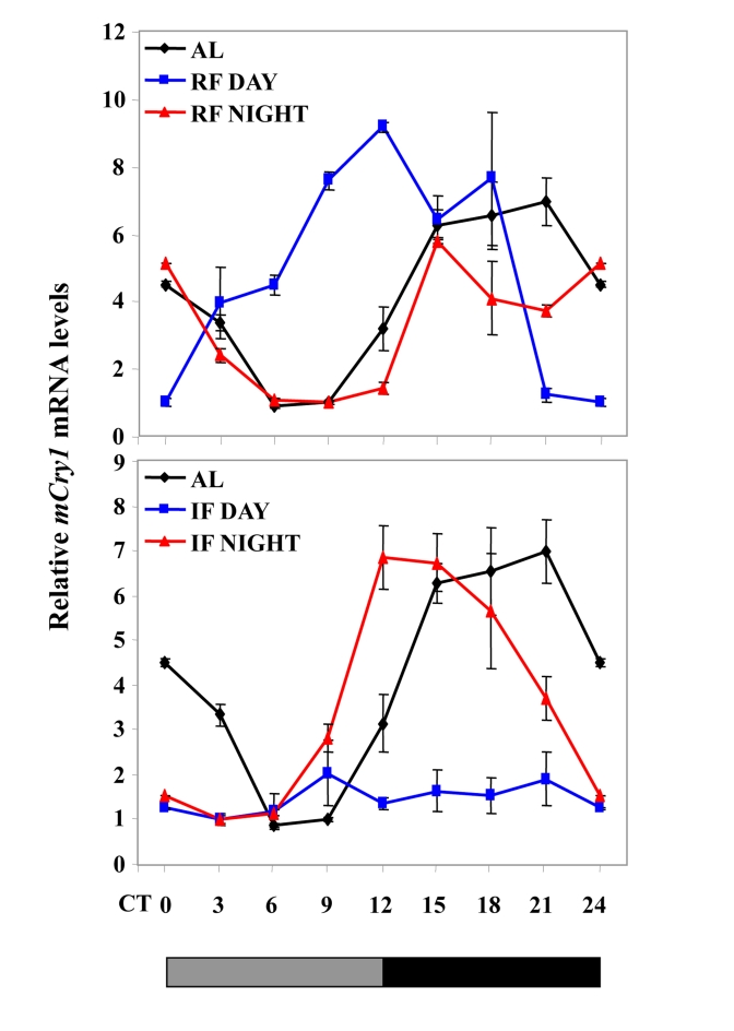 It is difficult to eliminate the effect of temporal food consumption in calorically restricted animals, as mice consume their food within a few hours. αMUPA mice spontaneously consume reduced calories (20-30% reduction) compared with WT mice under different feeding regimens, i.e. AL, RF and IF, suggesting that these mice can be utilized as a model for CR in the absence of the imposed temporal food consumption under ad libitum feeding, and a model for imposed temporal CR under RF or IF conditions. Therefore, the transgenic mouse model αMUPA [225] has recently been used to investigate the contribution of calorie reduction per se vs. timed feeding to clock adaptation [49]. Under light-dark conditions and ad libitum feeding, αMUPA mice show high amplitude, appropriately reset circadian rhythms in peripheral clock genes [194] (Figure 5). This finding could reflect the effect of the reduced calorie intake on the SCN in αMUPA mice, as has been previously reported for calorically restricted animals [190-192].