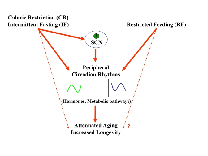 RF entrains peripheral clocks due to temporal food consumption, whereas CR and IF appear to synchronize the central pacemaker in the SCN, suggesting a role for a metabolicstate imposed by low calories in central clock entrainment. In αMUPA mice, reduced calories alone were found not to be sufficient to sustain rhythms, unless feeding was spontaneously timed at night, or timed at day through a restricted feeding protocol. Therefore, it appears that when reduced calories are timed, as always occurs during CR and IF regimens, clock adjustment can influence a wide variety of output systems, so that cellular and physiological systems perform in a more synchronised and appropriately reset manner. We assume that SIRT1 could be a key mediator in clock synchronization at least under CR. Robust circadian rhythms can ensure a better tissue and body homeostasis, and could constitute an important mediator in aging attenuation and longevity extension (Figure 6).