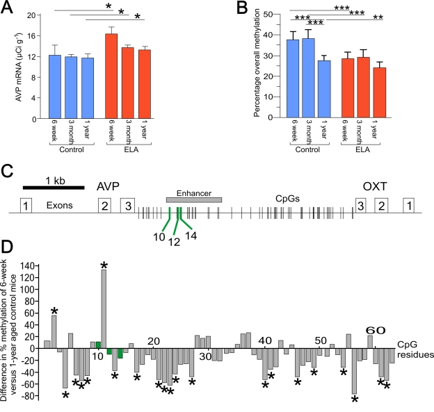 A recent study in mice sheds new light on this topic. Murgatroyd and coworkers [12] showed that early-life adversity (daily 3-hour separation of mouse pups from their mother during postnatal days 1−10) caused persistent hypomethylation at a discrete region of the arginine vasopressin (AVP) gene enhancer (Figure 1C) in the hypothalamic nucleus paraventricularis (PVN). This led to a sustained overexpression of AVP (Figure 1A), a key activator of the hypothalamo-pituitary adrenal (HPA) stress axis. As a result, early-life adversity evoked a lifelong elevation in glucocorticoid (GC) secretion, heightened endocrine responsiveness to stressors, reduced stress coping ability and memory deficits. All of these neuroendocrine and behavioral alterations are well-known risk factors for aging and frequent features of age-associated brain pathologies such as major depression and dementia (for review [13, 14]).
