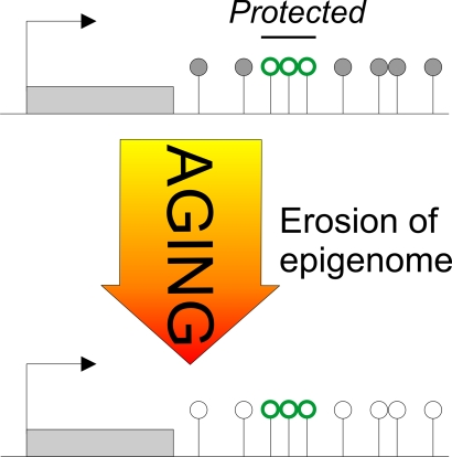 Aside from global hypomethylation, a number of specific loci have been reported to become hypermethylated during aging (the ribosomal gene cluster, the estrogen receptor, insulin growth factor, E-cadherin, c-fos etc.; reviewed in [10]). In general terms, age-associated hypermethylation is thought to preferentially affect loci at CpG islands, while loci devoid of CpG islands loose methylation with age. In addition, a study in humans has revealed that intra-individual changes in DNA methylation show some degree of familial clustering, indicative of a genetic component [11].