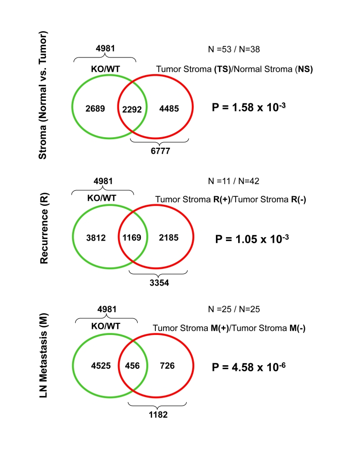 These three gene lists were then individually intersected with the transcriptional profile of Cav-1 (-/-) null stromal cells [8]. The results of these intersections are presented in Figure 1, as Venn diagrams. Most important- ly, significant overlap was seen with all three gene lists. Greater than 2,000 genes were common between the Cav-1 (-/-) stromal gene list and the gene transcripts upregulated in breast cancer tumor stroma (p = 1.6 x 10-3). Also, more than 1,000 gene transcripts were common between the Cav-1 (-/-) stromal gene list and the gene transcripts upregulated in the breast cancer tumor stroma of patients with tumor recurrence (p = 1 x 10-3). Finally, nearly 500 genes were commonly upregulated between Cav-1 (-/-) stromal cells and the breast cancer tumor stroma of patients with LN metastasis (p = 4.6 x 10-6). Thus, the transcriptional profiles of Cav-1 (-/-) stromal cells are most ignificantly related to the tumor stroma of patients with LN-metastasis. Independently, our previous data demonstrated that a loss of stromal Cav-1 protein expression (by immuno-histochemistry) in human breast cancers is specifically associated with a 2.6-fold increase in the number of tumor cell positive lymph nodes (LN-metastasis) [3,4].