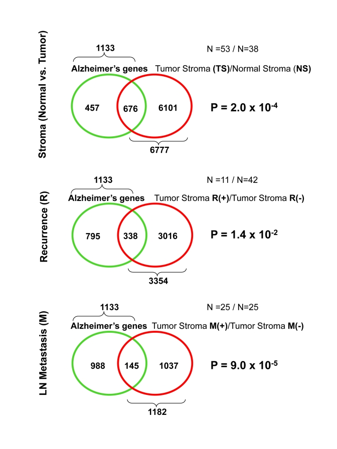 (a) the set of stromal genes that are upregulated in breast cancer tumor patients versus normal breast stroma; (b) the set of stromal genes that are upregulated in recurrence positive versus recurrence negative breast cancer patients (c) the set of stromal genes that are upregulated in lymph-node metastasis positive versus lymph-node metastasis negative breast cancer patients.