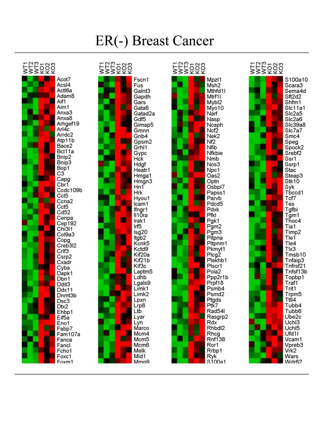 These include key overlapping genes associated with metabolism and glycolysis (Acot7, Acsl4, Eno1, Gapdh, Ldhb, Mtrf1l, Pfkl, Pgk1, Pgm2, Pgm3, Slc2a5, Slc2a6), hypoxia (Hyou1), the inflammatory response (Aif1, C3, Ccl5, Crlf3, Ifngr1, Il10ra, Irak1, Irf5, Isg20, Nfib, Nfkbie, Nos3, Tnfaip3, Tnfrsf21, Tnfsf13b, Traf1), myofibroblast differentiation and the extracellular matrix (Actl6a, Capg, Col9a3, Dnmt3b, Mmp9, Myo10, Spock2, Tgfbi, Tgm1, Timp2), as well as DNA-damage and repair (Ddit3, Rad54l). These results are consistent with the existence of the "Reverse Warburg Effect" in ER-negative breast cancers.