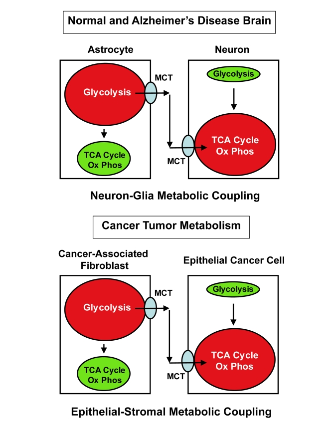 Finally, the "Reverse Warburg Effect" is strikingly similar to the theory of "Neuon-Glia Metabolic Coupling" [11-18], which was proposed more than 10 years ago to explain metabolic changes associated with normal synaptic transmission, which may be exacerbated during neuronal stress and neuronal degeneration, as in Alzheimer's disease. In "Neuron-Glia Metabolic Coupling", astrocytes undergo aerobic glycolysis, secrete energy-rich metabolites (pyruvate and lactate), and neurons then take up these metabolites and use them in the neuronal TCA cycle to generate high amounts of ATP. Thus, we propose that "The Reverse Warburg Effect" we observe could also be more broadly termed "Epithelial-Stromal Metabolic Coupling".