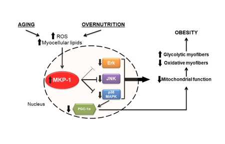 More recently we have been able to provide mechanistic insight in to the pathway linking MKP-1 to mitochondrial function. We have found that MKP-1 is a key regulator of the master controller of mitochondrial biogenesis, PGC-1α [15]. When mice are fed a high-fat diet, the expression levels of MKP-1 in skeletal muscle increase which results in a reduction in PGC-1α levels. In contrast, PGC-1α levels are maintained in mice lacking MKP-1 [15]. Consistent with the notion that PGC-1α promotes oxidative myofiber composition MKP-1-deficient mice are refractory to the switch from oxidative to glycolytic myofibers seen in wild type mice fed a high fat diet and remain lean. These observations support the idea that MKP-1 plays an important role in maintaining skeletal muscle health. Mechanistically, MKP-1 appears to control a pool of nuclear p38 MAPK activity that is responsible for phosphorylating PGC-1α on residues that promote its stability. Therefore, increased MKP-1 expression levels result in a reduction of p38 MAPK-mediated PGC-1α phosphorylation and ultimately, stability. Collectively, these observations raise the possibility that impairment in mitochondrial function might arise through disturbing the dynamic homeostatic balance between MKP-1 and p38 MAPK activity in the nucleus. The precise contribution of MKP-1, as well as other MKPs which have the capacity to dephosphorylate p38 MAPK in the nucleus, to mitochondrial dysfunction in either aging or overnutrition still remains to be fully realized. Nevertheless, these recent insights provide a platform from which these questions can be addressed.