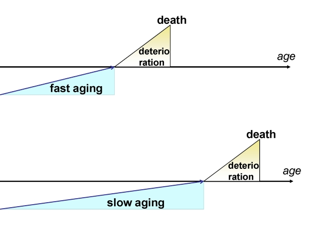 Importantly, current increase in healthy lifespan (increased longevity with late onset of age-related diseases) is not caused by natural selection. It happens in the same generation. Slow aging was not selected but was simply revealed (Figure 2 B). Until recently, most slow-aging individuals died prematurely. They (we) did not necessarily die young but nevertheless died not from aging. For example, at the same chronological age when fast-aging individuals died from heart attack, healthy slow-aging individuals died from malnutrition and infections, for instance. Elimination of premature death greatly enriched chronologically old population with slow-aging (biologically young) individuals (Figure 2).