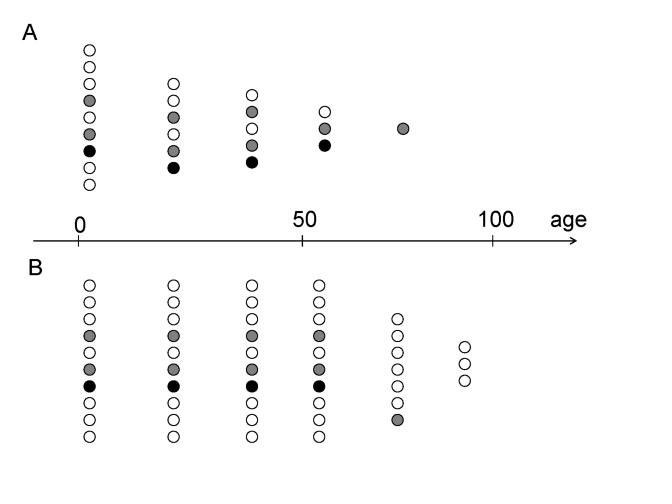 To be possibly correct, the hypothesis requires a high proportion of slow-aging individuals at birth (Figure 2). Otherwise, there would be too few slow-aging individuals to make a difference later (Figure 2 A vs B). Why was not slow aging selected out? Slow aging must be beneficial for women, by increasing their reproductive period. In fact, female's fertility is decreasing early in life (starting from late twenties, long before menopause). This reproductive aging is one of the earliest manifestations of aging in females. So slow aging benefits females. Also, as I will discuss elsewhere, women do not need to be as robust as men, so can afford to age slower (see forthcoming article "Why men age faster but reproduce longer: mTOR perspective"). In turn, males inherit genes for longevity too, explaining a high proportion of slow-aging individuals at birth.