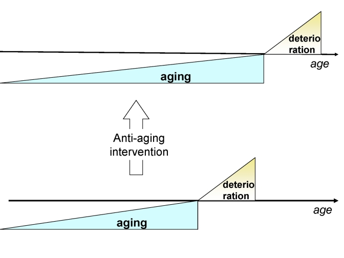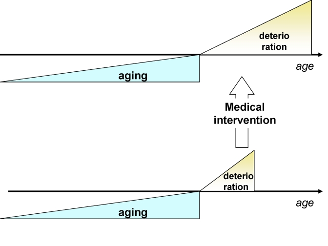 Deceleration of aging, manifested as "healthy aging", increases the ratio of healthy to unhealthy people (Figure 4). Furthermore, the ability to work is determined by biological age. Slow aging may delay retirement until later in life (as also suggested by Vaupel [3]) and in turn may provide the means for society to support further development of increasingly powerful (and expensive) conventional medicine. Then lifespan can be extended by both anti-aging medical intervention (to delay morbidity) and specialized medical intervention (to prolong morbidity stage).