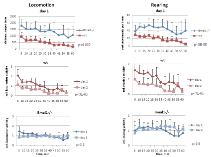 In the same experiments, vertical (rearing) activity was measured by registering the sequential crossing of beams up and down in vertical direction. Similar to the difference in horizontal activity, total rearing activity of Bmal1-/- mice was significantly increased compared to wild type animals (2.3-fold and 4.7-fold on days 1 [F[1,5] = 13.92, P = 0.014] and 2 [F[1,5] = 22.57, P = 0.00031], respectively (Figure 1, right panel). On day2 wild type mice demonstrated 1.9-fold reduction in total rearing activity [F[1,5] = 24.34, P = 0.004], whereas no difference between the two days was detected in Bmal1-/- animals [F[1,5] = 0.37, P = 0.568] (Figure 5, lower right). In contrast to differences displayed in horizontal activity, animals of both genotypes displayed similar rearing activity during the first 5 min of exposure to the new environment. After this, rearing activity of wild type animals gradually decreased, whereas in Bmal1-/- mice it increased and stayed elevated for the duration of testing (Figure 1, right). On day 2, the temporal pattern of rearing activity in animals of both genotypes did not differ much from the one displayed on day1. Taken together, these data indicate that deficiency in core circadian component, BMAL1, affects not only rhythmicity in locomotor activity, but other patterns of behavior as well. Specifically, when placed in a new environment, BMAL1-deficient mice display novelty-induced hyperactivity in locomotion and rearing behavior, and deficits in inter- and intrasessional habituation.