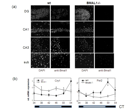 BMAL1 is expressed in many different tissues and organs. Brain-specific Bmal1 expression at the mRNA level has been demonstrated for the suprachiasmatic nucleus of the anterior hypothalamus (SCN), the residence of the master circadian clock, as well as for other brain regions including the cortex and hippocampus formation [12,18]. To investigate the distribution of BMAL1 protein in the brain, we performed in situ immunofluorescent staining using BMAL1-specific antibody (Figure 2a). High expression of BMAL1 was detected in the pyramidal neurons of the hippocampus and in the neurons of the subiculum and enthorhinal cortex of wt mice. Neurons of the neocortex were also positive for BMAL1. Specificity of the signal was confirmed by the parallel staining of the brains of Bmal1-/- mice. Thus, BMAL1 protein is expressed in brain structures associated with memory formation.