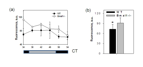Aging is associated with increased oxidative stress in many tissues, including the brain. Recently, oxidative stress and misbalance in reactive oxygen/nitrogen species (ROS/RNS) homeostasis was proposed as a mechanism for age-dependent changes in brain physiology, including decline in memory and learning [22]. Previously we have demonstrated that BMAL1 is directly involved in the regulation of ROS/RNS homeostasis, and that accelerated aging characteristic for Bmal1-/- mice, at least in part, can be attributed to excessive production of ROS in some tissues of Bmal1-/- animals [4]. This prompted us to compare the levels of ROS in the brain of wild type and Bmal1-/- mice.