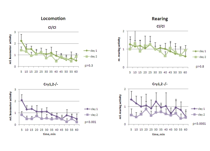 Cry1,2-/- and Clock/Clock mice were placed in novel environment, similarly to experiments described for wild type and Bmal1-/- animals. In contrast to Bmal1-/- mice, they did not demonstrate hyperactivity in locomotion: the activity of Clock/Clock on day1 was indistinguishable from that of the wild type [F[1,5] = 1.77, P = 0.241], while Cry1,2-/- animals were even less active [F[1,5] = 3.23, P = 0.132] (Figure 4 and 5, left panels). Both Clock/Clock [F(11,55) = 13.12, P<0.001] and Cry1,2-/- [F(11,55) = 8.02, P<0.001] mice showed intrasessional habituation on day1 similar to that of the wild type mice: distance traveled during the last 15 minutes decreased more than 2 fold compared to the first 15 minutes. On day2, Clock/Clock mice demons-trated the level of locomotor activity indistinguishable [F[1,5] = 3.95, P = 0.103] from that on day1. Thus, although Clock/Clock mice showed intrasessional habituation similar to wild type (both on days 1 and 2), there was no intersessional habituation (no significant difference between days 1 and 2). These data suggest that that Clock/Clock mutant mice have normal formation of the immediate memory of novel context and impaired long-term memory. Locomotor activity of Cry1,2-/- mice on day2 was significantly lower than on day1 (Figures 4 and 5, left) (2.0 folds, [F[1,5] = 27.19, P = 0.003]), suggesting that Cry1,2-/- demonstrate both intra- and intersessional habituation.
