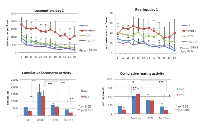 Cumulative data on locomotor and rearing activities showing significant differences between the animals of all tested genotypes are summarized in Figure 5. Thus, total distance traveled by Bmal1-/- mice on both days greatly exceeded the distance traveled by the wild type [day1 fold 2.8, t-test P <0.01; day2 fold 4.7, P <0.001], Clock/Clock [day1 fold 2.3, t-test P <0.01; day2 fold 2.4, P <0.01], or Cry1,2-/- [day1 fold 3.9, t-test P <0.001; day2 fold 6.9, P <0.001] animals (Figure5, left panels). Cry1,2-/- mice demonstrated the lowest level of horizontal activity, while the locomotion of the Clock/ Clock animals was comparable to that of the wild type. Remarkably, the horizontal activity of Bmal1-/- and Clock/Clock mutants remained the same on both days of the experiment, whereas wild type and Cry1,2-/- animals demonstrated significant reduction in activity on day2 [wt fold 2.0 t-test P <0.02; Cry1,2-/- fold 2.1, P <0.01] (Figure 5, lower left). Rearing activity of Bmal1-/- and Clock/Clock animals was elevated compared to wt [Bmal1-/- day1 fold 2.3, t-test P <0.01, day2 fold 4.7, P <0.001; Clock/Clock day1 fold 1.8, P <0.01, day2 fold 3.2, P <0.001] and showed no differences between the two sessions. In contrast, wild type and Cry1,2-/- mice showed low rearing activity and robust intra- and intersessional habituation (Figure 5, right panels).