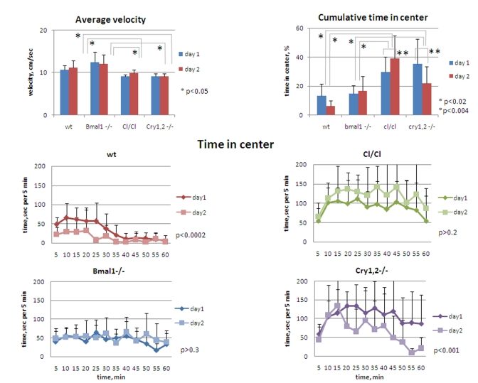 High locomotor and rearing activity and deficit of contextual habituation often correlate with elevated level of anxiety, which can be accessed by the amount of time spent in the center of the OF (a risk-taking behavior) [23]. To evaluate the level of anxiety in animals of all four circadian genotypes, we compared the time they spent in the central zone of the OF (Figure 6). On day1 of the experiment, Bmal1-/- and wild type mice spent about 14% of the time in the central zone, while the corresponding time in Cry1,2-/- and Clock/Clock mice was more than two-fold higher (37% and 30% respectively [t-test P <0.01]) (Figure 6, upper right). The differences between the wild type and Bmal1-/-, and between Clock/Clock and Cry1,2-/- animals were not significant. Compared to day1, the amount of time spent in the center on day2 was not changed in Bmal1-/- , whereas in wild type and Cry1,2-/- mice it was decreased two-fold [t-test P <0.01]. Interestingly, cumulative center time of Clock/Clock mice on day2 showed even a tendency for increase but did not reach statistical significance. Thus, none of the tested circadian mutants displayed a pro-anxiety phenotype in the open field paradigm. On the contrary, Clock/Clock and Cry1,2-/- demonstrated opposite, more risk-taking behavior. A decrease in center time on day2 observed in wild type and Cry1,2-/- mice correlates with a decrease in total locomotor and vertical exploratory activity (indicative of habituation). Bmal1-/- again did not demonstrate any difference in performance between days 1 and 2, while Clock/Clock mutant mice demonstrated an increase in time spent in the center. Interestingly, mice of different genotypes had different patterns of the risk-taking behavior. Wild type mice "took the risk" of short raids in the middle of the brightly-lit arena during the first 30 min and then moved mainly along the walls or sit in one of the corners (Figure 6, middle left). Bmal1-/- mice continued to move across the center during the entire session (Figure 6, lower left). Both Cry1,2-/- and Clock/Clock mice had an increase in time spent in the center after first 10 min, during which they had prolonged periods of sitting in the middle of the arena - a very unlikely behavior for wt mice (Figure 6, middle and lower right). These data clearly demonstrate the lack of correlation between the locomotor/rearing activity and time spent in the center of the open field in different circadian mutants. Thus, hyperactive Bmal1-/- demonstrated "normal" level of anxiety, while both hyperactive Clock/Clock and hypoactive Cry1,2-/- had decreased level of anxiety. Therefore, hyperactivity and deficit of contextual habituation of Bmal1-/- and Clock/Clock cannot be explained by the increase in the level of anxiety in these mice.