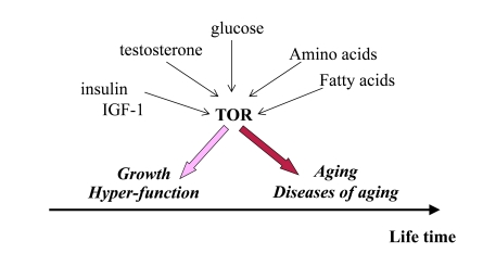 Thus, over-activation of mTOR may provide an advantage (muscle hypertrophy, high levels of testosterone and high spermatogenesis) in early life at the cost of accelerated aging later in life. As an illuminating example, mice over-expressing growth hormone exhibit increased levels of IGF-I and adult body size, reduced life span and reproductive life span [26]. (Note: IGF-I stimulates mTOR, Figure 1).