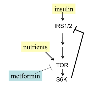 Nutrients activate mTOR and cause insulin-resistance in cell culture [49,50] as well as systemically in rodents and humans [51-54]. There is a negative feedback loop between insulin signaling and TOR (Figure 2). When mTOR is activated, it blocks insulin signaling (insulin resistance) [49,55]. Noteworthy, insulin resistance is associated with premature menopause in some patients [56].