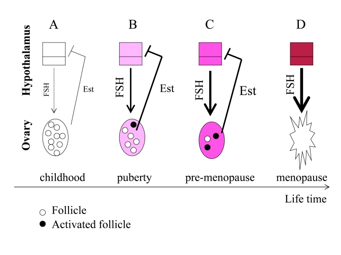 Before puberty, the hypothalamus is extremely sensitive to estrogens (Figure 3 A). Even low levels of estrogens suppress FSH production and, therefore, levels of FSH are low. At puberty, the hypothalamus becomes more resistant to estrogens. Then low levels of estrogens cannot suppress FSH. FSH in turn stimulates the ovarian follicles. Follicles produce estrogens, which in turn inhibit FSH production (Figure 3 B). During lifetime, resistance to estrogens continues to increase (Figure 3C). This ever-increasing resistance is an aim-less continuation of the same program that initiated menstrual cycle at puberty. FSH is elevated in pre-menopause and rising serum FSH levels is one of the earliest signs of human female reproductive aging [61], [62]. Rising FSH levels over-stimulate the ovaries (Figure 3C), thus depleting follicles (Figure 3D).