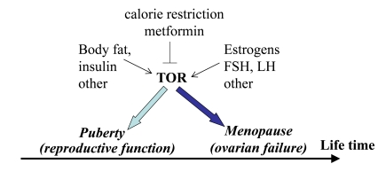 First, mTOR is a regulator of puberty onset via modulation of the hypothalamus [67]. Also, both FSH and estrogens activate the mTOR pathway [68], [69]. So if TOR is activated constantly, it may not respond further to stimulation (hormone resistance).