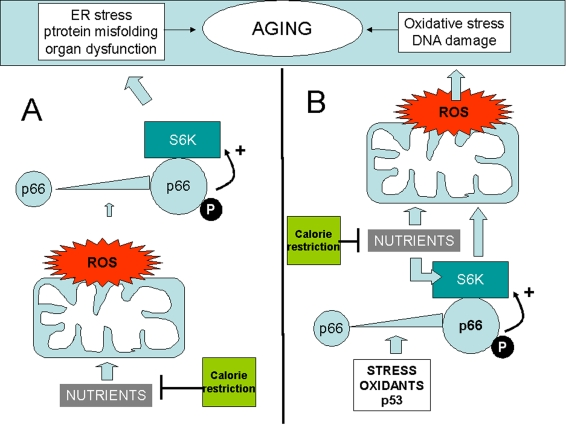 In all the above scenarios, p66, S6K and ROS lie on the same nutrient sensitive pathway, mechanistically linked to aging and potentially targetable by calorie restriction (Figure 1 A and B).