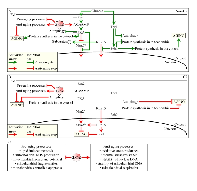 In one mechanism, this bile acid targets longevity pathways that control chronological aging irrespective of the number of calories available to yeast. Because these pathways modulate longevity regardless of calorie availability, we called them "constitutive" or "housekeeping" [1]. LCA modulates these housekeeping longevity assurance pathways by suppressing lipid-induced necrosis, attenuating mitochondrial fragmentation, altering oxidation-reduction processes in mitochondria, enhancing resistance to oxidative and thermal stresses, suppressing mitochondria-controlled apoptosis, and enhancing stability of nuclear and mitochondrial DNA ([1]; Figure 1C). The housekeeping longevity pathways do not overlap with the TOR (target of rapamycin) and cAMP/PKA (cAMP/protein kinase A) signaling pathways ([1]; Figure 1A), both of which are "adaptable" by nature because they are under the stringent control of calorie and/or nutrient availability ([2-6]; Figure 1B).