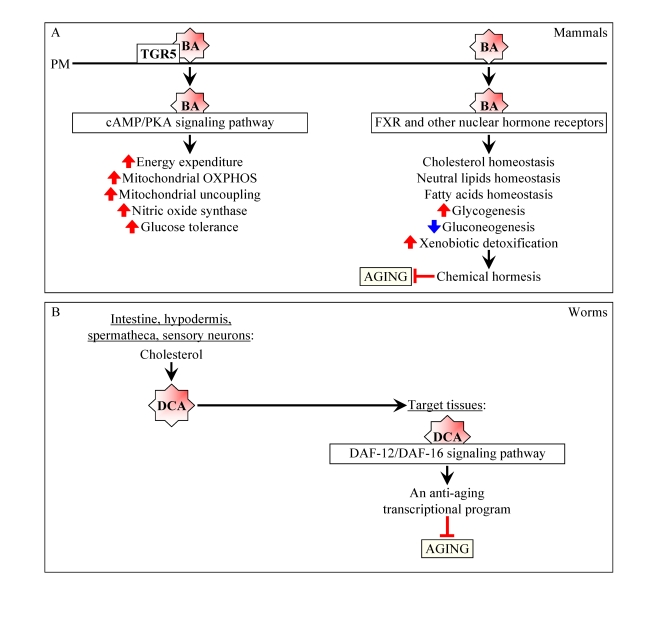 Although bile acids in mammals have been traditionally considered only as trophic factors for the enteric epithelium and detergents for the emulsification and absorption of dietary lipids [9-11], they are now also recognized for their essential role as signaling molecules regulating lipid, glucose and energy homeostasis and activating detoxification of xenobiotics ([9-14]; Figure 2A). Many of the numerous health-improving metabolic effects caused by bile acids and their demonstrated ability to protect mammals from xenobiotic toxins ([9-14]; Figure 2A) suggest that, by improving overall health, these amphipathic molecules may delay the onset of age-related diseases and have beneficial effect on longevity. Furthermore, because of the elevated levels of several bile acids in the long-lived Ghrhrlit/lit mice and due to the ability of cholic acid administered to food of wild-type mice to activate transcription of numerous xenobiotic detoxification genes, it has been proposed that, by promoting chemical hormesis in mammals, these mildly toxic molecules with detergent-like properties may extend their longevity by acting as endobiotic regulators of aging [15-18]. Moreover, bile acid-like dafachronic acids (including 3-keto-LCA) in worms function as endocrine regulators of aging by activating an anti-aging transcriptional program governed by the DAF-12/DAF-16 signaling cascade ([19-21]; Figure 2B). Altogether, these findings support the notion that bile acids are beneficial to health and longevity in animals because of their ability to operate as potent signaling molecules that modulate a compendium health- and longevity-related processes. Noteworthy, by modulating many of these processes also in yeast, LCA extends their longevity [1]. It is likely therefore that the life-extending capacity of LCA and other bile acids as well as, perhaps, the mechanisms underlying their anti-aging action are conserved across animal species and other phyla.