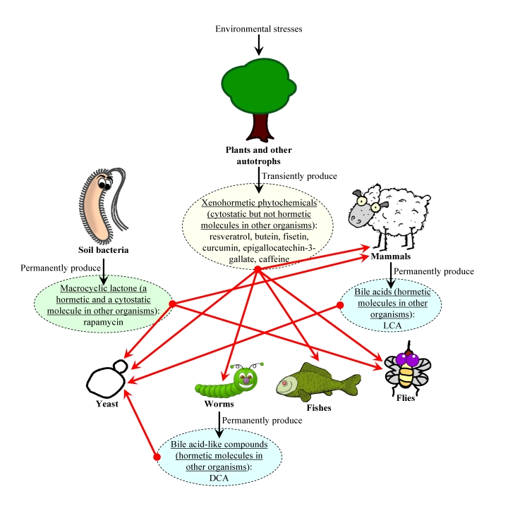 In our unified hypothesis (Figure 3), organisms from all domains of life (i.e., bacteria, fungi, plants and animals) within an ecosystem are able to synthesize chemical compounds that 1) are produced and then released into the environment permanently or only in response to deteriorating environmental conditions, increased population density of competitors and/or predators, or changes in food availability and its nutrient and/or caloric content; 2) are mildly toxic compounds that trigger a hormetic response in an organism that senses them or, alternatively, are not toxic for any organism within the ecosystem and do not cause a hormetic response; 3) are cytostatic compounds that attenuate the TOR-governed signaling network (e.g., rapamycin and resveratrol) or, alternatively, do not modulate this growth-promoting network (e.g., LCA and other bile acid) and 4) extend longevity of organisms that can sense these compounds, thereby increasing their chances of survival and creating selective force aimed at maintaining the ability of organisms composing the ecosystem to respond to these compounds by undergoing specific life-extending changes to their physiology. Our hypothesis implies that the evolution of longevity regulation mechanisms in each group of the organisms composing an ecosystem is driven by the ability of this group of organisms to undergo specific life-extending physiological changes in response to a compendium of "critical" chemical compounds that are permanently or transiently released to the ecosystem by other groups of organisms.
