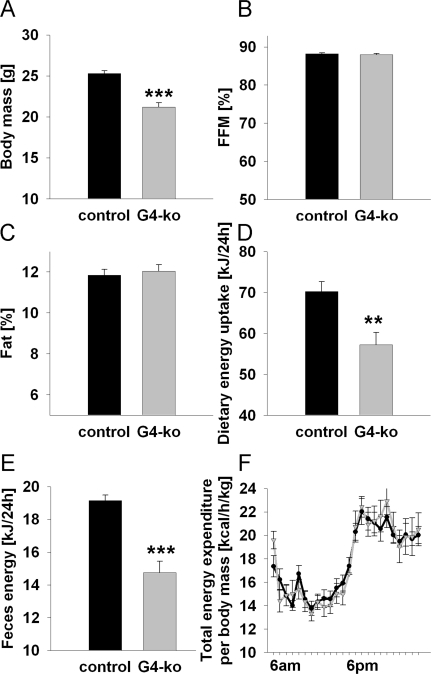 As previously reported [9,10], Terc -/- G4 mice are smaller and have reduced body mass (Figure 1A). However, we here show that this reduction affects both lean mass (Figure 1B) and body fat (Figure 1C) to the same extent. We moreover demonstrate that both dietary energy uptake (Figure 1D) and energy excretion via faeces (Figure 1E) is reduced. However when these latter findings are normalized to body mass, no significant differences can be found for neither energy uptake nor energy excretion (data not shown). Furthermore, no glucosuria was detected in none of the genotypes (data not shown), precluding differential loss of energy via urine. Accordingly determination of energy expenditure as quantified by indirect calorimetry did not show any differences regarding energy turnover at neither day- nor night-time (Figure 1F).