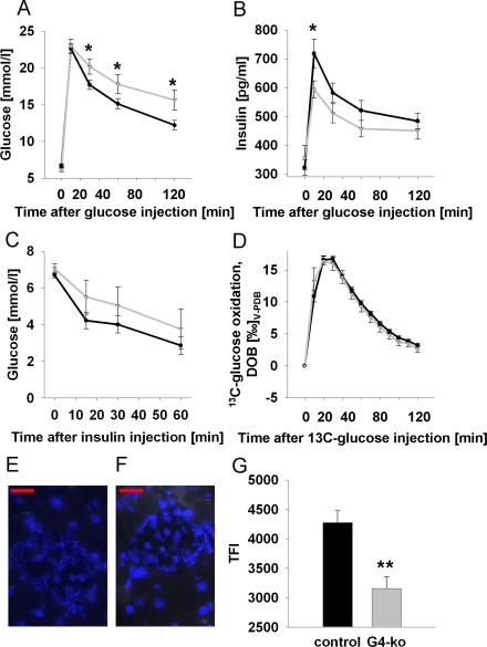 We next performed intra-peritoneal glucose tolerance tests (ipGTT) on Terc -/- G4 and on the control genotypes, and observed impaired glucose clearing in Terc -/- G4 mice (Figure 2A). We then aimed to elucidate whether impaired insulin secretion or rather insulin resistance may be responsible for this phenotype. We therefore first quantified plasma insulin levels during conditions of ipGTT, and observed impaired insulin secretion in response to injected glucose in Terc -/- G4 mice (Figure 2B). By contrast, performing intra-peritoneal insulin tolerance tests (ipITT) by injecting insulin into mice did not reveal significant differences in glucose disposal in response to insulin (Figure 2C). Since telomerase has been reported to affect mitochondrial function [11,12], we lastly quantified glucose oxidation rates by injecting uniformly 13C-labeled glucose to quantify the exhalation of 13CO2, which was found to be identical in all genotypes (Figure 2D), precluding systemic mitochondrial dysfunction in Terc -/- G4 mice, at least in regards to glucose-derived pyruvate oxidation capacity.