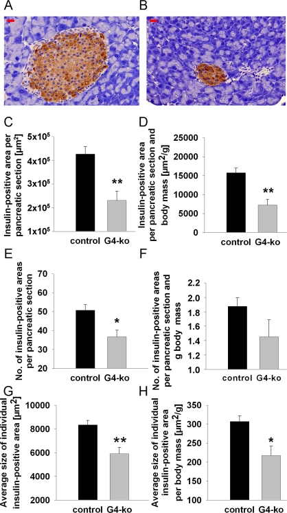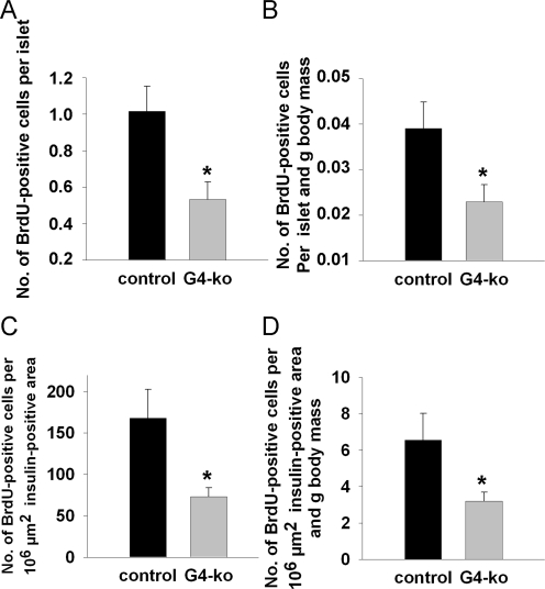 We next injected bromo-desoxyuridine (BrdU) into mice prior to sacrifice which enables us to determine the number of DNA-replicating, i.e. dividing beta cells, after counterstaining with an anti-BrdU antibody. We found a reduction of BrdU-positive beta-cells per islet (Figure 4A) as well as after normalization for body mass (Figure 4B). Lastly, the number of BrdU-positive beta-cells per standardized insulin-positive area was also found to be reduced (Figure 4C) as well as after normalization for body mass (Figure 4D).