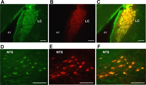 Double fluorescence immunohistochemistry in the LC showed that immunoreactivity for TH (Figure 1A) and that for nesfatin-1 (Figure 1B) overlapped extensively in neurons in the LC (Figure 1C), demonstrating colocalization of two molecules in the LC neurons. Similarly, immunoreactivities for TH (Figure 1D) and nesfatin-1 (Figure 1E) overlapped in neurons in the NTS (Figure 1F), confirming previous reports [3,17].