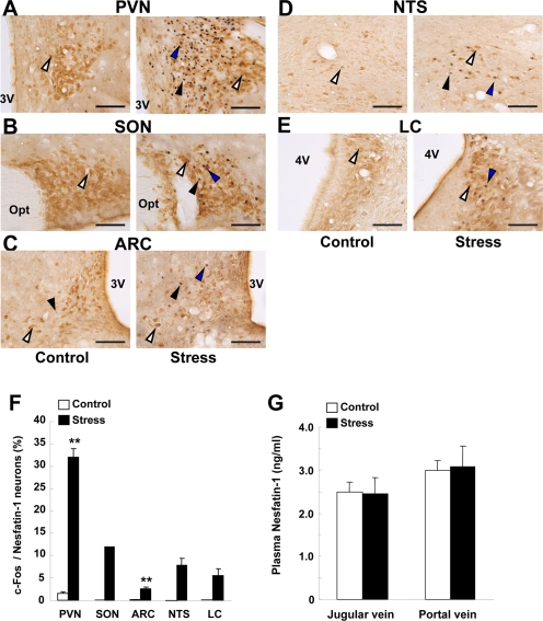 Restraint stress induced c-Fos expressions in nesfatin-1 neurons in the hypothalamus and brain stem but failed to alter plasma nesfatin-1 concentrations