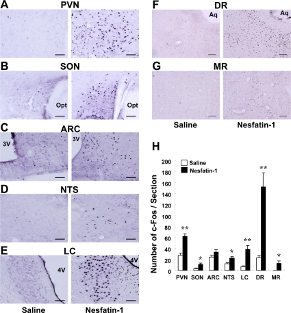 We showed that icv injection of nesfatin-1 induces c-Fos expression in CRH, NA and 5-HT neurons in the PVN, NTS and DR, respectively. In particular, a large fraction (28.3%) of CRH neurons expresses c-Fos in the PVN after icv nesfatin-1. Furthermore, nesfatin-1 directly interacts with and increases [Ca2+]i in a substantial fraction (25%) of CRH neurons isolated from the PVN, in accord with previous report that nesfatin-1 changes electrical activities of CRH neurons [19]. Thus, nesfatin-1 activates CRH neurons both in vivo and ex vivo. These results demonstrate that nesfatin-1 targets the PVN CRH neurons.