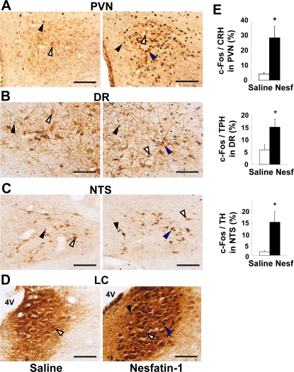 Double-labeling immunohistochemistry for c-Fos and nesfatin-1, CRH, NA or 5-HT