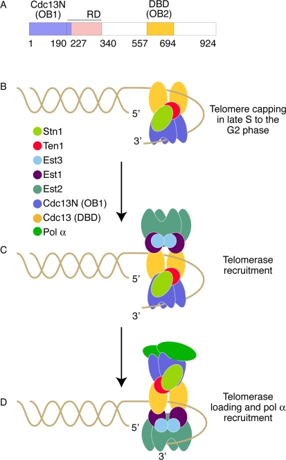 Telomeres are short DNA repeats added to the ends of chromosomes by the reverse transcriptase telomerase [1,2], a ribonucleoprotein enzyme that uses an integral RNA template for DNA replication [3]. Telomeres prevent loss of genetic information, arising due to the “end replication problem” and protect the linear ends of chromosomes from recombination events and exonucleolytic degradation, all of which could lead to genomic instability and cell cycle arrest or death. Telomeres accomplish this task together with proteins that work exclusively at the ends of chromosomes to prevent such deleterious events and maintain cell viability. One of these proteins in budding yeast is Cdc13, which associates with single stranded telomeric DNA with high affinity and specificity [4,5]. Cdc13's ability to protect the ends of chromosomes is mediated in concert with the proteins Stn1 and Ten1 which together assemble into what is commonly known as the CST [Cdc13/Stn1/Ten1] complex [6,7] and which shares structural similarities with the replication protein A (RPA) complex [8]. Cdc13 further maintains the integrity of the chromosome ends by recruiting a number of factors, including telomerase and the DNA polymerase α (pol α), both of which are required for DNA replication [9-11]. It is well established that telomere elongation by telomerase takes place in late S to the G2 phase of the cell cycle [12,13] and when the G-rich overhang is of sufficient length for proper telomerase holoenzyme assembly [14,15].