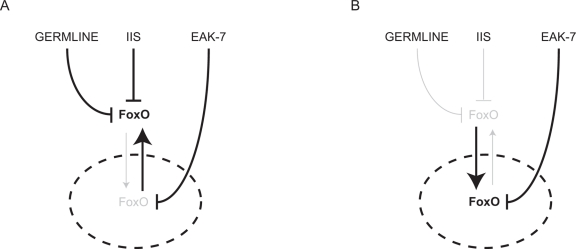 Although nuclear localization of DAF-16/FoxO is clearly necessary for DAF-16/FoxO-dependent lifespan extension, multiple lines of evidence indicate that it is not sufficient for full DAF-16/FoxO activation. For example, a DAF-16/FoxO mutant lacking all four canonical Akt/PKB phosphorylation sites localizes to the nucleus but fails to fully extend lifespan [24,29]. This indicates that a second pathway acts in parallel to Akt/PKB and the germline to inhibit the activity of nuclear DAF-16/FoxO.