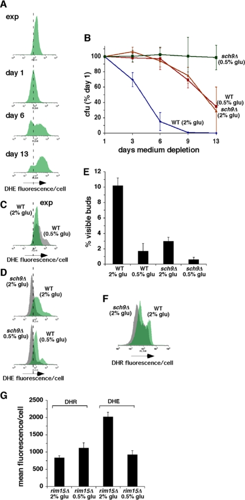 Chronological lifespan experiments require the establishment of exponentially dividing cultures of cells that eventually deplete nutrients from the medium, leading to entry into a non-dividing stationary phase state a few days later. Compared to exponential cultures, intra-cellular levels of O2- detected by the fluorescent probe dihydroethidium (DHE), which can detect superoxide [17], initially declined during the few days of experiments but then gradually accumulated with time in stationary phase (Figure 1A). The chronological age-dependent accumulation of O2- occurred in parallel with loss of reproductive capacity as measured by colony-forming units (Figure 1B; “WT 2% glu”). As reported earlier [18], both the accumulation of O2- and loss of reproductive capacity in stationary phase cells were accompanied by an increase in cell death as measured by uptake of the membrane-impermeable DNA stain propidium iodide (PI) (Figure S1), which does not stain viable cells with intact membranes. The rate of cell death was accelerated in cells with visible buds that failed to exit the cell cycle in stationary phase compared to cells without visible buds (Figure S1). This is consistent with an earlier report that a subpopulation of stationary phase cells that includes all budded cells exhibits elevated levels of apoptosis [19].