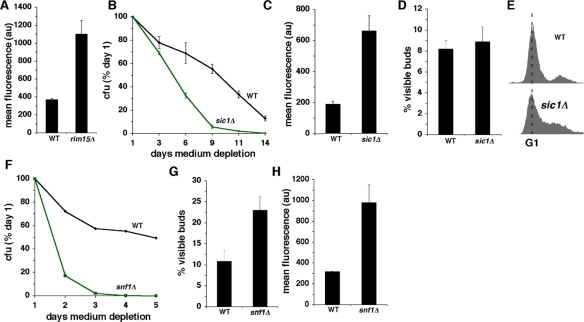 The mammalian cyclin-dependent kinase inhibitor p27 blocks entry into S phase when mitogenic growth signaling is downregulated in mammalian cells [25]. Sic1p, the budding yeast homologue of p27, similarly inhibits entry of budding yeast cells into S phase when they enter into a nutrient depletion-induced stationary phase growth arrest [26]. As reported earlier [27], inactivation of Sic1p shortens CLS (Figure 2B). Similar to the effects of the constitutively active Ras2 or deletion of RIM15, the shorter CLS of sic1Δ cells is accompanied by increased O2- (Figure 2C). Although in this strain background (W303), deletion of SIC1 did not increase the number of cells with visible buds (Figure 2D), budding is uncoupled from DNA replication in sic1Δ cells in some genetic backgrounds [26]. Measurements of DNA content by flow cytometry confirmed that a large fraction of stationary phase W303 sic1Δ cells were growth-arrested in S phase, despite a low frequency of buds (Figure 2E). Uncoupling of budding from DNA replication was not observed, however, in sic1Δ cells in a different genetic background (CEN.PK). sic1Δ cells in this background arrested growth in stationary phase with a substantial increase in the fraction of cells with visible buds (Figure S4).