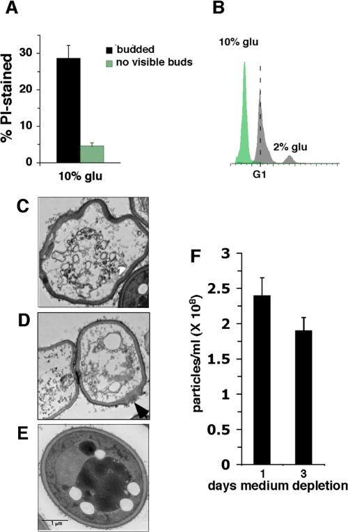 Furthermore, at day 2 of medium depletion, cells in 10% glucose SC cultures were more frequently undergoing apoptosis compared to cells in 2% glucose SC indicated by increased apoptotic degradation of DNA. In fact almost all the cells in 10% glucose cultures harbored substantially less than the complete G1 complement of DNA required for continued viability (Figure 4B). Electron microscopic visualization of stationary phase cells cultured in 2% glucose YPD medium revealed that some cells exhibited fragmented nuclei indicative of apoptosis as well as an irregular cell shape indicating deterioration of the cell wall structure (Figure 4C and D). This contrasted with the appearance of intact nuclei and cell walls in non-apoptosing cells (Figure 4E). In some cases, disruption of the cell wall structure was detected at specific sites in apoptosing cells (Figure 4D; arrow) that may correspond to the location of a bud that broke off in cells undergoing apoptosis. A decline in numbers of cells in 10% glucose SC stationary phase cultures from day 1 to day 3 measured by counting particles (Figure 4F) confirmed that similar to mammalian cells, budding yeast cells undergoing apoptosis eventually are completely destroyed. We conclude that high glucose reduces the efficiency of G0/G1 arrest in stationary phase and preferentially kills dividing cells, and that the reduced number of cells with visible buds in 10% glucose SC cultures is caused by the specific and rapid apoptotic destruction of cells that failed to arrest growth in G0/G1.