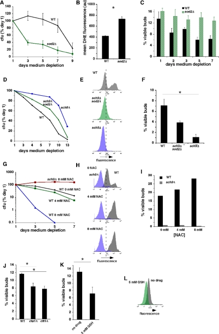 We also asked whether treatment of cells with the antioxidant N-acetylcysteine (NAC) would extend CLS and increase the efficiency of stationary phase G0/G1 arrest in association with reduced levels of superoxide. Surprisingly, NAC shortened CLS in a dose-dependent fashion in wild type, but not sch9Δ cells (Figure 5G). The shorter CLS conferred by NAC in wild type cells occurred in concert with dose-dependent increases rather than decreases in levels of O2- (Figure 5H). Similar pro-oxidant effects of the antioxidants α-tocopherol and coenzyme Q10 were recently reported in budding yeast [39], and induction of O2- by NAC has been reported in mammalian cells as well [40]. Increased O2- in wild type cells exposed to NAC was accompanied by a parallel dose-dependent increase in the fraction of cells with visible buds (Figure 5I). NAC-induced increases in O2- and frequency of G0/G1 arrest in stationary phase were absent in sch9Δ cells (Figure 5H and I; “sch9Δ”). The absence of NAC effects in sch9Δ cells expressing elevated levels of Sod2p [4] suggests that in wild type cells, the effects of NAC are related to increased amounts of O2- and not to unrelated toxic effects of this compound. In contrast, cells in which the catalases Cta1p or Ctt1p had been inactivated, which exhibit reduced levels of O2- in stationary phase and a longer CLS [8], also exhibited fewer visible buds (Figure 5J). Similarly, cells treated with the antioxidant glutathione (GSH) also exhibited fewer visible buds (Figure 5K) in concert with reduced levels of O2- (Figure 5L). We conclude that O2- inhibits growth arrest of stationary phase cells in G0/G1.