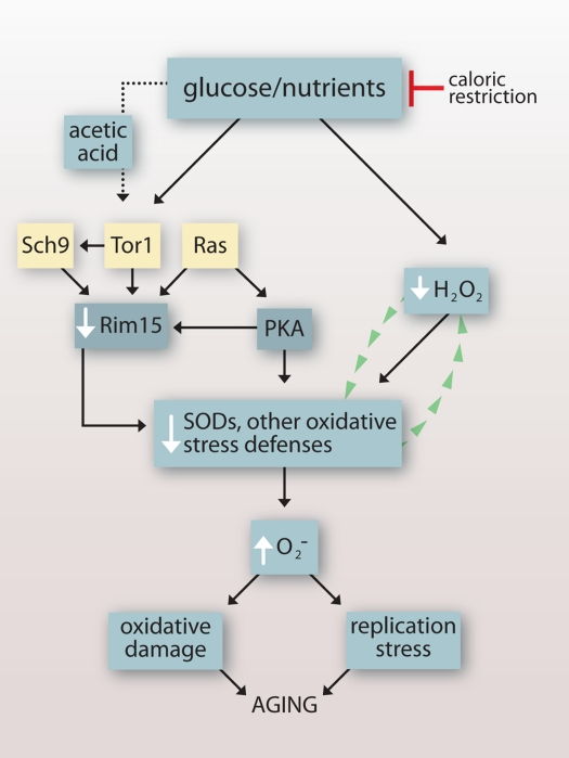 A number of recent studies have investigated the impact of conserved growth signaling pathways on chronological lifespan (CLS) in the model organism Saccharomyces cerevisiae (budding yeast). CLS of this organism is determined by measuring the length of time cells maintain viability or reproductive capacity after nutrient depletion induces a stationary phase growth arrest. Growth arrest in stationary phase mimics the quiescent, postmitotic state that occurs in higher eukaryotes when growth-signaling pathways are downregulated during differentiation. The results of many of these studies support the free radical theory. For example, CLS is extended by inactivation of the budding yeast SCH9 gene encoding a homologue of the mammalian AKT protein [3]. Stationary phase sch9Δ cells express elevated levels of the Mn-dependent superoxide dismutase Sod2p [4] and exhibit lower levels of superoxide anions (O2-) [5]. CLS is also extended by inactivation of the mammalian Ras homologue RAS2 via a mechanism that depends on Sod2p [4] and by inactivation of conserved TOR growth signaling pathways, which also leads to a reduction in levels of O2- [5,6]. When active, Tor1p, Sch9p and Ras2p inhibit the Rim15p kinase and its induction of superoxide dismutases and other oxidative stress defenses, and reduced signaling through these pathways in calorie-restricted cells extends CLS in a Rim15p-dependent fashion [7]. CR or inactivation of catalases also extends CLS by inducing elevated levels of hydrogen peroxide (H2O2), which inhibits the accumulation of intracellular O2- by activating superoxide dismutases [8]. Conversely, a shorter CLS in concert with elevated levels of O2- have been detected in stationary phase budding yeast cells in which the cAMP phosphodiesterase Pde2p has been inactivated [9]. Pde2 inhibits Ras2p-dependent growth signaling, which is constitutively active in pde2Δ cells [10].