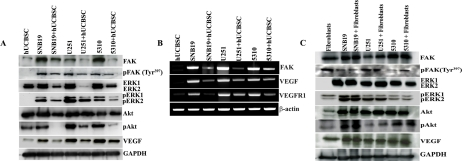 Single and co-cultures of glioma cells or nude mice brain tissues were harvested and homogenized in four volumes of homogenization buffer and processed for cell lysates as described previously [27]. Samples (40μg of total protein) were subjected to 8-14% SDS-PAGE and transferred onto nitrocellulose membranes. The reaction was detected using Hyperfilm-MP autoradiography film (Amersham, Piscataway, NJ). The following antibodies were used for Western blot analysis: mouse anti-FAK (1:200; Santa Cruz Biotechnology, Santa Cruz, CA), mouse anti-pFAK and all other pFAK antibodies (1:500; Santa Cruz), goat integrin αvβ3 (1:500; Santa Cruz), mouse anti-ERK (1:5000; BD Biosciences, Franklin Lakes, NJ), rabbit anti-AKT (1:1000; Cell Signaling), mouse anti-Ang1 (1:1000; Cell Signaling), rabbit anti-VEGF [Phospho-Rac1/cdc42 (Ser71) antibody (1:1000; Cell Signaling], and mouse anti-Tie2 (1:1000; BD Biosciences). Immunoblots were stripped and redeve-loped with GAPDH antibody [mouse anti-GAPDH (1:1000; Santa Cruz)]to ensure equal loading levels. Experiments were performed in triplicate. Values for treated and untreated samples were compared using one-way ANOVA. A p value of <0.05 was considered significant.
