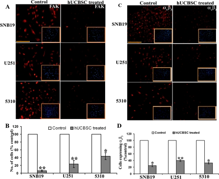 FAK is a widely expressed cytoplasmic protein tyrosine kinase involved in integrin-mediated signal transduction and plays an important role in the control of several biological processes, including cell spreading, migration, survival and angiogenesis. We evaluated the expression of FAK by immunofluorescence and observed that hUCBSC inhibited the expression of FAK (Figure 3A). In co-cultures of glioma cells, the number of cells expressing FAK was very low as compared to control cells. Also, FACS analysis of single and co-cultures of glioma cells revealed that FAK expression was significantly inhibited by hUCBSC treatment (Figure 3B). This downregulation was significantly pronounced in co-cultures of SNB19 compared to U251 and 5310 co-cultures. Since FAK is associated with integrin signaling, we tested the expression of integrin αvβ3 in glioma cells and their co-cultures. Similar to FAK expression, hUCBSC inhibited the expression of αvβ3 in co-cultures (Figure 3C). Quantitative analysis revealed that SNB19 had a lower percentage of cells expressing αvβ3 followed by 5310 and U251 (Figure 3D). To confirm these results, we isolated total RNA from single and co-cultures of glioma cells with hUCBSC and converted it into cDNA. We ran cDNA microarrays to test the array of genes related to angio-genesis that were affected by hUCBSC treatment. Most of the genes involved in angiogenesis were downregulated many times over by hUCBSC treatment (Table 1). In particular, Ang1 and Ang2 genes were downregulated apart from the growth factors EGF, FGF2, IGF1, PDGF-A and VEGF-A. This is associated with downregulation of Akt. These results confirm that hUCBSC influence a wide array of genes involved in angiogenesis, thereby controlling the growth of glioma cells.
