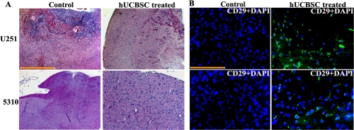 The Institutional Animal Care and Use Committee of the University Of Illinois College Of Medicine at Peoria approved all surgical interventions and post-operative animal care. U251 (1×106 cells) and 5310 (8×105 cells) tumor cells were intracerebrally injected into the right side of the brains of nude mice, as described previously [30]. Seven days after tumor implantation, the mice were injected with hUCBSC near the left side of the brain. The ratio of the hUCBSC to glioma cells was maintained at 1:4. Three weeks after tumor inoculation, six mice from each group were sacrificed by cardiac perfusion with 4% formaldehyde in PBS, their brains were removed, and paraffin sections were prepared. Sections were stained with H&E to visualize tumor cells and to examine tumor volume. The sections were blind reviewed by a neuropathologist and scored semiquantitatively for tumor size. Whole-mount images of brains were also taken to determine infiltrative tumor morphology. The average tumor area per section integrated to the number of sections where the tumor was visible was used to calculate tumor volume; tumor volumes were compared between controls and treated groups.